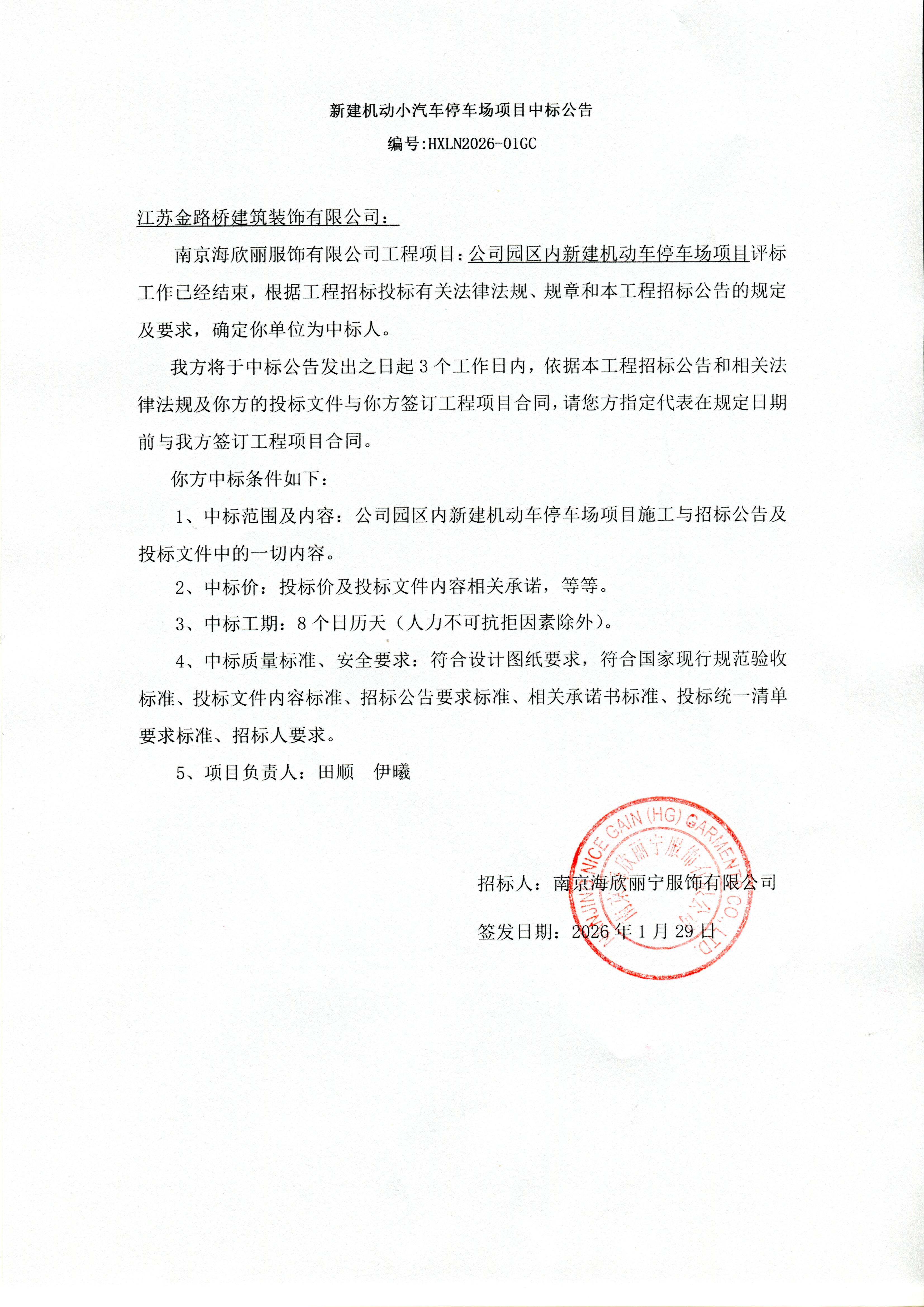 南京海欣丽宁服饰有限公司停车场中标公告
